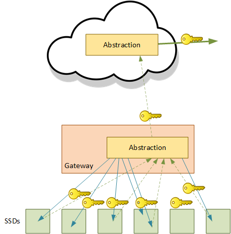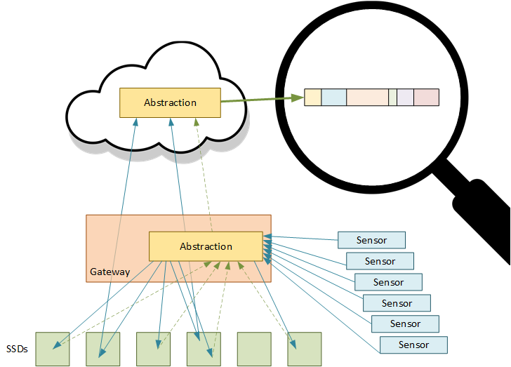Let’s move up a level in the architecture now, into a world where the basic unit of storage isn’t a flash cell or even a flash chip: it’s a solid-state drive (SSD). Let’s say that you’ve got a bunch of sensors in your industrial IoT (IIoT) setup, and they’re constantly sending data for storage. Some of that data you’re going to keep locally; some you’re going to push up to the cloud. However, if you request a data view from your phone app, any data – whether stored locally or in the cloud – should be viewable.