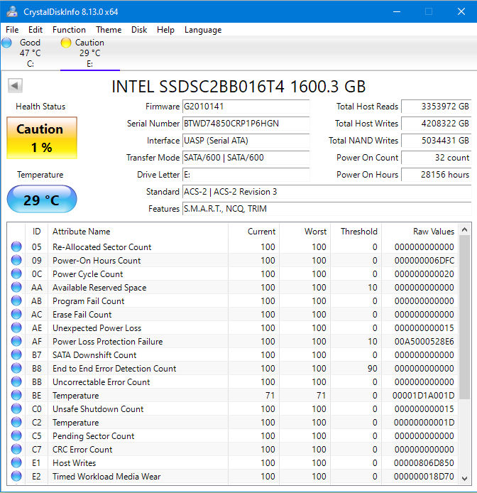 This SSD thinks it’s not very healthy. You can tell from the big yellow rectangle labeled “Caution.” The reason that the SSD doesn’t feel healthy appears in the reporting box labeled “Total Host Writes.” That box says that a host wrote 4,208,322 Gbytes to the drive. That’s more than 4000 Tbytes of data written to a 1.6Tbyte drive, which means that, on average, every Flash memory location on this SSD has been overwritten more than 2600 times. The SSD reports that it’s been powered on for 28156 hours. That’s more than three years of continuous operation, yet this SSD has gone through only 32 power cycles since it was manufactured. Even so, the SSD seems to be performing very well based on the other statistics in the CrystalDiskInfo report. There are no reallocated sectors, no erase failures, no CRC errors, and no end-to-end errors detected. I take that as a testament to the excellent hardware design and the ruggedness of the Intel SSD’s Flash memory. (Note: Intel completed the sale of its NAND Flash and SSD business to SK Hynix late last year, and the assets will move from Intel to SK Hynix over the next few years. Meanwhile, SK Hynix is putting the SSD assets from Intel into a new company named Solidigm.)
