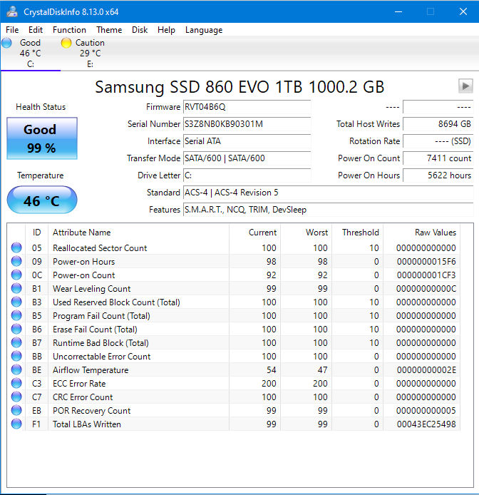 In fact, with the right software, you can query an SSD and find out exactly where it is in its life cycle. I use a program called CrystalDiskInfo. It gives me a comprehensive report on my SSD’s health. The report on the SSD in my work laptop PC looks like this: