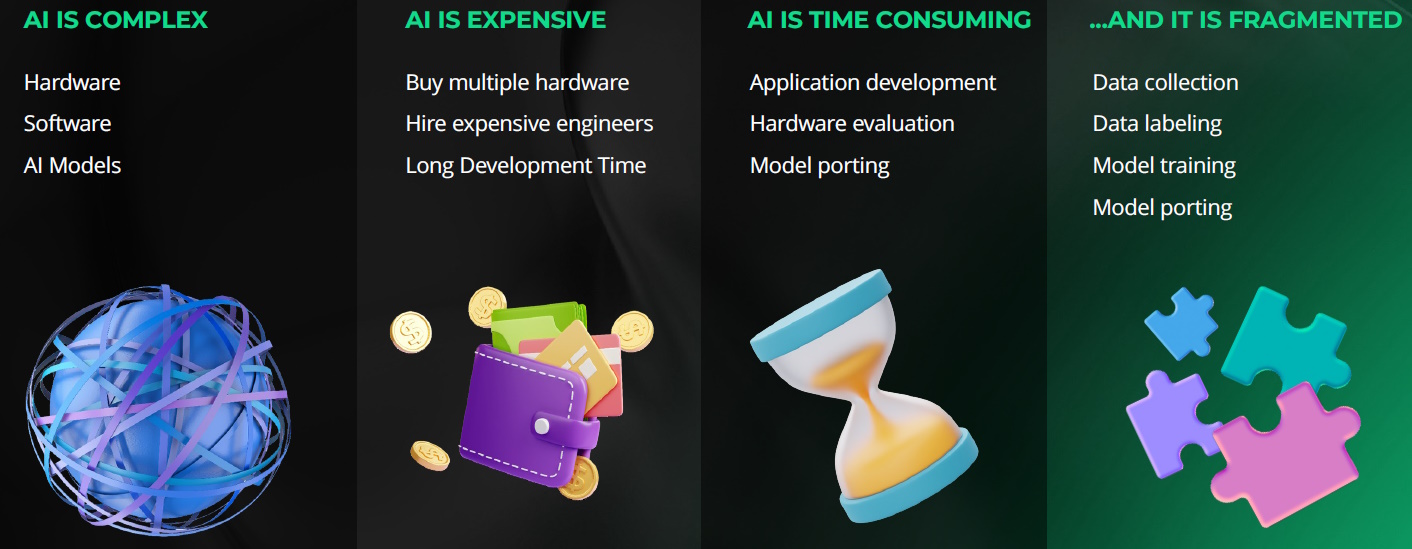 Basically, creating AI applications and deploying them at the edge is complex. Most people don’t understand AI all that well (although every year they understand it better). It’s expensive because there’s a lot of hardware engineers and software developers involved, and development times can be soooo looong.