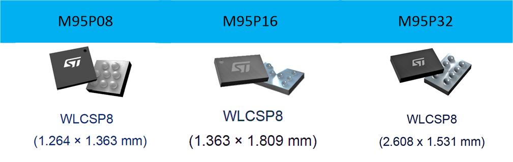 ST’s three members of the M95P serial EEPROM family are offered in standard, pin-compatible SO-8 packages and in three different wafer level chip scale (WLCS) packages.