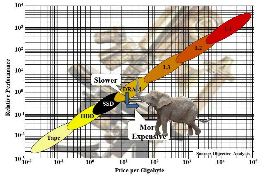 “…although CXL DRAM may have longer latency than local DRAM due to the need for transactions to pass through at least one CXL switch, CXL may also attain higher bandwidth than closely coupled DRAM thanks to those 64 GT/sec CXL channels. It all depends on the CPU, the integrated memory controllers, the CXL memory controllers, the width of the CXL implementation, and the system design. So, The Memory Guy’s graph will need another oval blob for CXL memory, which Handy drew as an elephant for the purposes of this article. (Not too long ago, Handy’s graph had an oval blob for Intel’s Optane memory, positioned between DRAM and SSD, but Intel killed that product and Handy vaporized its blob. So, blobs come and go in Handy’s memory hierarchy, which merely reflects the fluid reality of computer design.)”