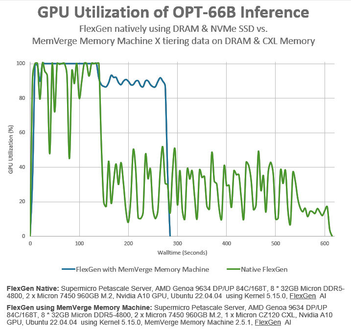 Without the additional CXL memory, the inference benchmark finishes in just over 600 seconds – ten minutes. With the CXL memory included through the Memory Machine software layer, the inference benchmark finishes in just under 300 seconds – five minutes. That’s a 2X improvement in system throughput with no modifications to the application program or the Linux OS.