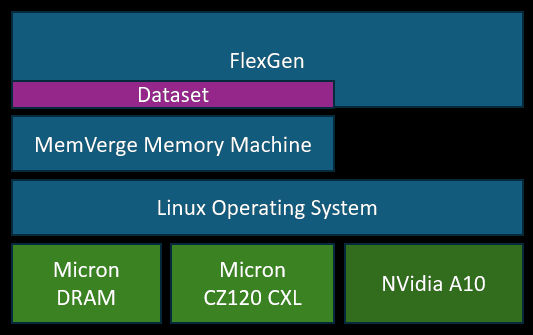 The software stack for MemVerge’s CXL experiment includes FlexGen, a high-throughput generative AI engine that runs large language models with limited GPU memory, running on an unmodified Linux OS. The MemVerge Memory Machine, when activated, unifies access to the local DRAM and CXL DRAM on a Micron CZ120 CXL module. Image credit: MemVerge