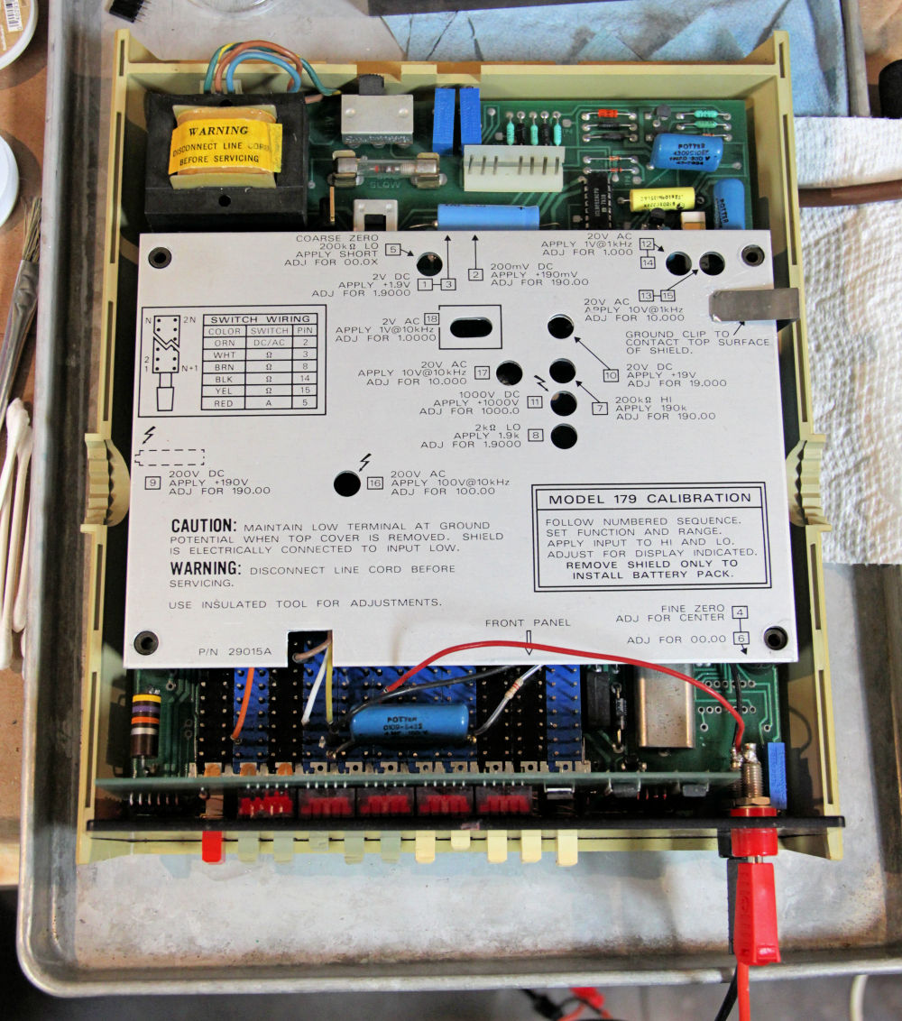 The Keithley Model 179 multimeter has a convenient calibration sequence printed on its electrostatic shield cover and a deadly exposed ac line fuse in the upper left part of the photo. Image credit: Steve Leibson