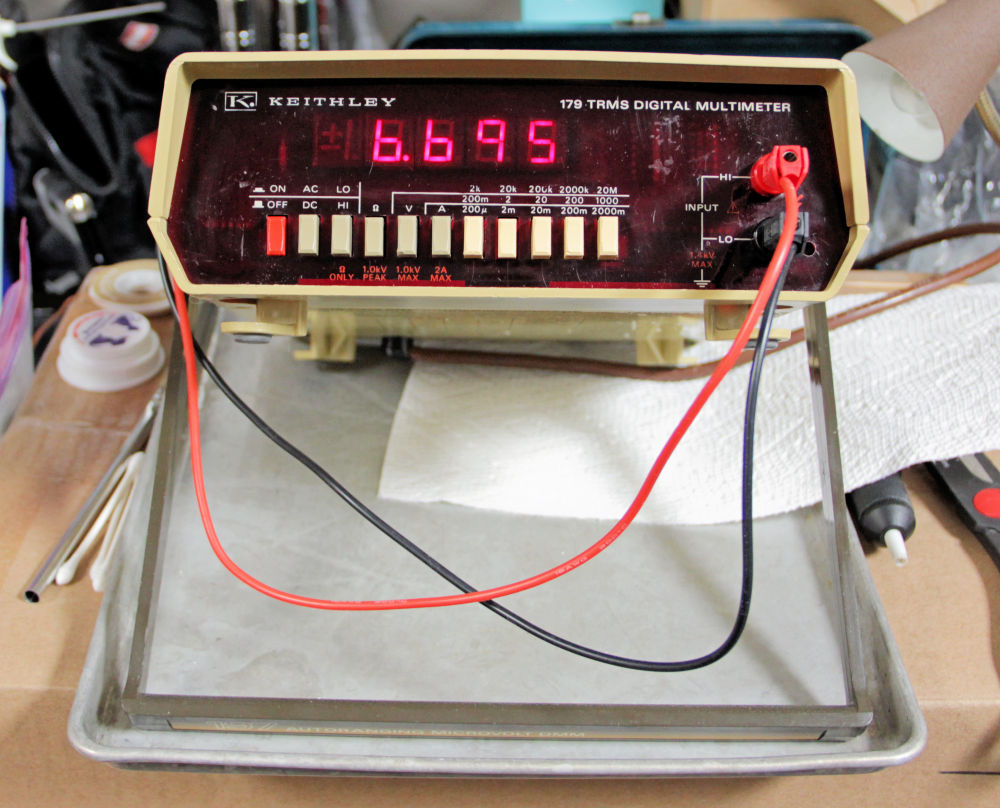 My next step was to verify the meter’s calibration. Because I saw no calibration stickers, I doubt that this meter had been calibrated at any time during this century, and possibly not since it left the factory in Cleveland forty years ago. I checked the Keithley 179 against my Surpeer AV4 multimeter, which had closely tracked an Agilent 34401 lab-grade meter when I checked it five years ago. The voltage scales seemed to work well. Next, I found a random 6.68K resistor and measured it with both the Keithley and the Surpeer meters. I then combined the resistor with a voltage to make a current source. (I didn’t have a way to test the ac ranges, but stay tuned.)
