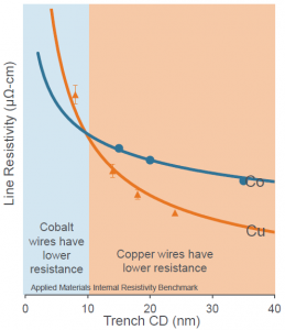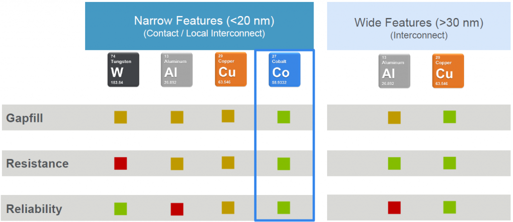 This time, we’re going to consider cobalt for interconnect. Applied Materials (“Applied” amongst friends) put together a comparison of tungsten, aluminum, copper, and cobalt. Notably, they made a distinction between narrow metal and wide metal features. So, for those of you silently asking the question, “Why now? What’s changed?” the answer is that feature size has changed.