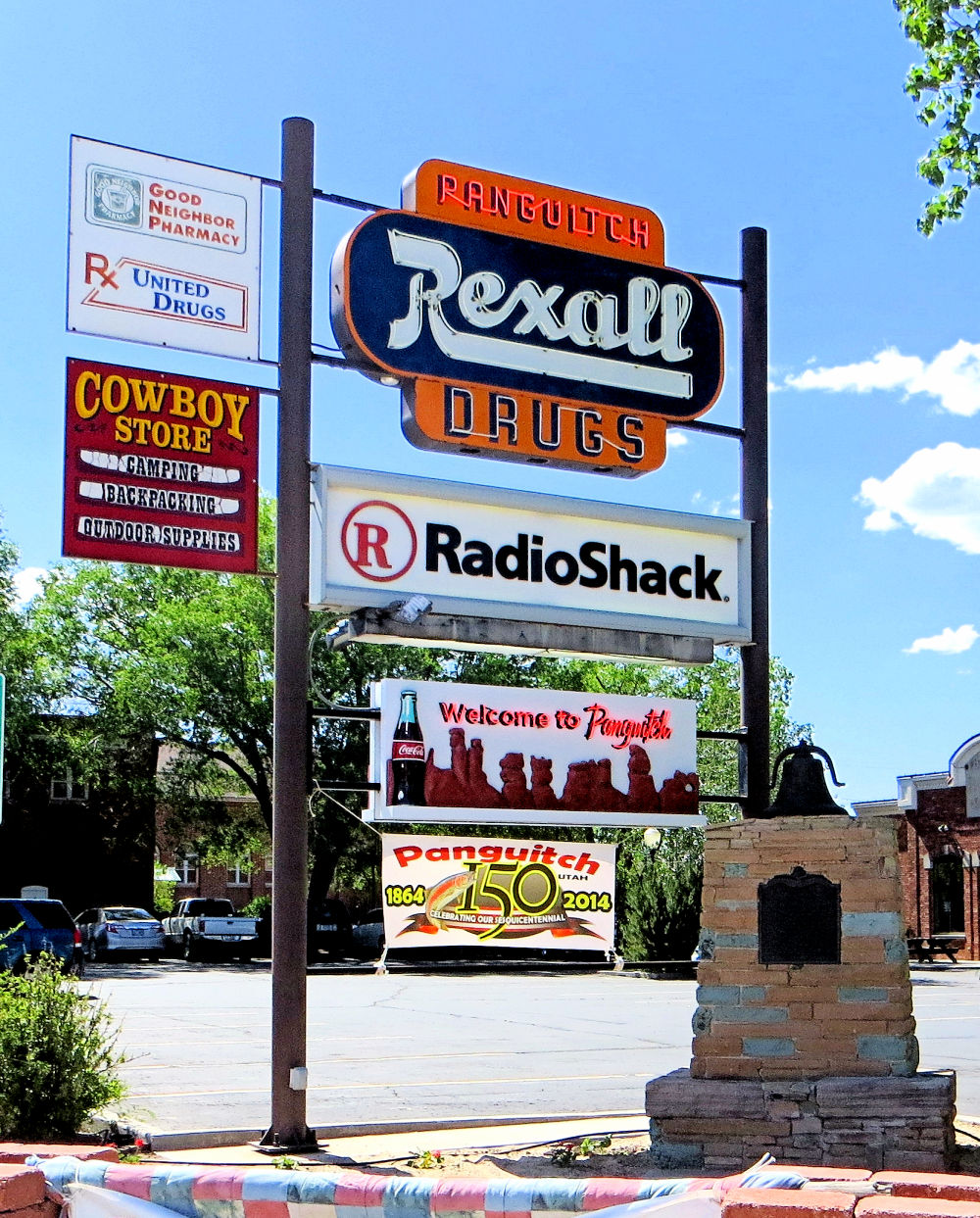 This photo of the Panguitch Drug Store sign from 2014 perfectly encapsulates the eclectic nature of the store, showing the pharmacy’s past affiliation with the Rexall Drug Store chain, the Radio Shack connection, the cowboy store, and a monument to an LDS Church building that formerly occupied the site until 1949. Today, an electronic billboard sign has replaced the Radio Shack sign. Image credit: Bill Kirchner