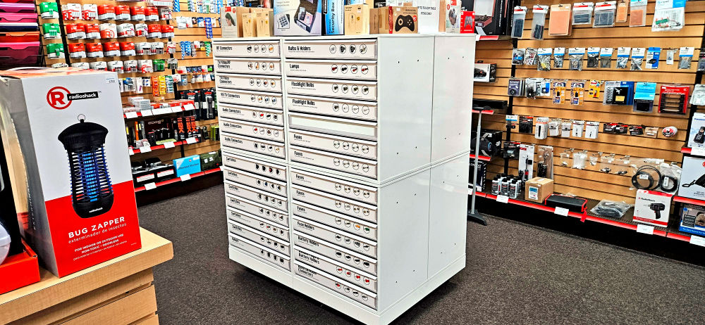 Component bins at the Radio Shack nook in the Panguitch Drug Store. You can see a couple of pc boards for electronic prototyping intermixed with solar cells hanging on the wall in the upper right corner of the photo. Image credit: Steve Leibson