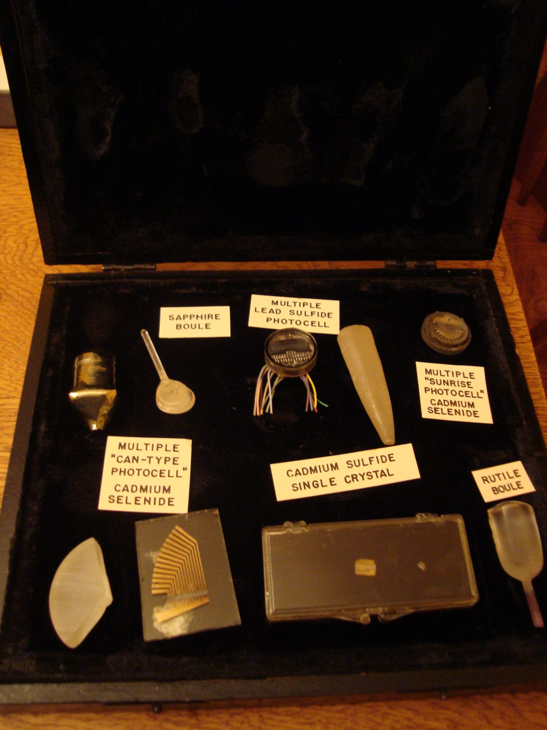 The above image clearly shows a connection between the sapphire (aluminum oxide) and rutile (titanium dioxide) gemstone boules produced by the Hugles during their previous venture and the cadmium sulfide crystal and the lead sulfide and cadmium sulfide thin-film photocells and photocell arrays they developed for Baldwin.