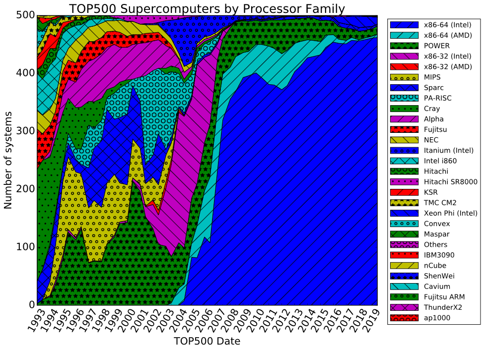 Looking at the first dozen years from the mid-90s onward, the mix is so jumbled that it’s hard to pick out the winners from the losers. (“Loser” here being defined as merely the 100th fastest computer in the entire world.) We’ve got SPARC chips, we’ve got Alpha chips, we’ve got PowerPC chips, we’ve got MIPS chips. We’ve even got Cray, Convex, and Maspar machines. The lead changed every time the chart got updated, and the overall mixture of architectures changed constantly. Oddsmakers would’ve had a tough time picking the winners and losers in the CPU sweepstakes back then. Just ask any VC on Sand Hill Road.