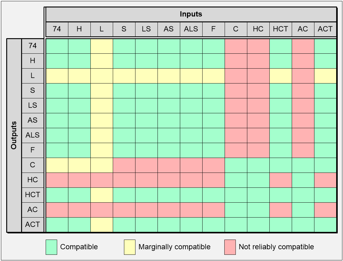 At first glance, this looks great, but can you spot the obvious error? You’re right. If there’s one thing we can be reasonably certain of, it’s that the outputs from each technology should be compatible with the inputs of the same technology. In turn, this means that, if nothing else, the diagonal formed by the cells starting in the upper left-hand corner and proceeding to the lower right-hand corner should all be green. So, why is it that the L (“Low-power”) outputs are shown as being only marginally compatible with the L inputs? This immediately casts the rest of the table into doubt (sad face).