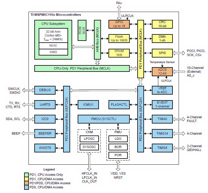 Here’s a block diagram of the MSPM0C110x microcontroller family:
