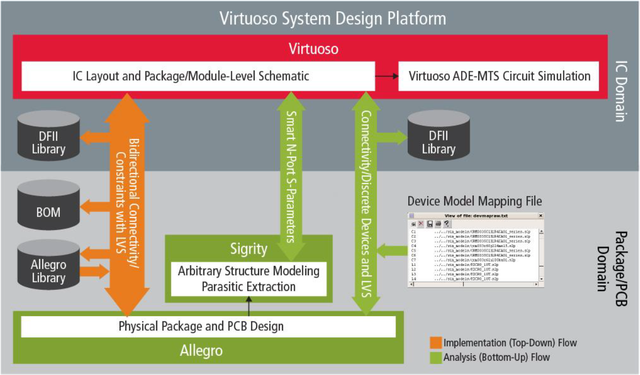 All of the connectivity, models, and libraries are managed automatically. They have a top-down approach for implementation, where you’re pulling all of the various pieces together, and a bottom-up approach that focuses on analysis. Digital chips can also be added via Open Access or by importing any other complete die that you might have acquired through some third party. Even discretes can be included, since many vendors will provide a device model mapping file. You then get a physical footprint and a schematic model for the module.