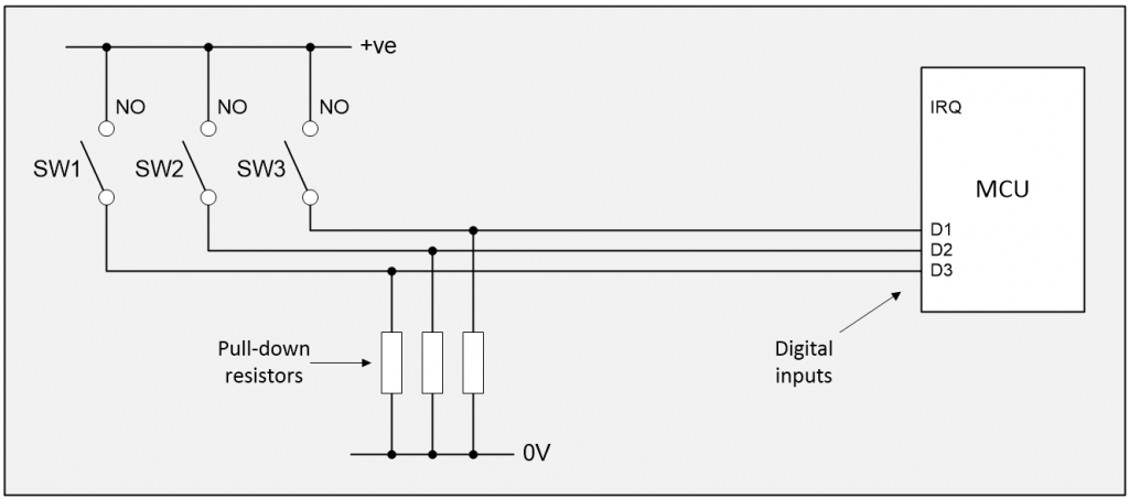 As an alternative to the above, we could OR the signals from the switches and use the output from the OR gate to drive an interrupt request (IRQ) input on the MCU as illustrated below. (Note that when I was a bright-eyed, bushy-tailed young engineer, MCUs typically had only one or two dedicated interrupt inputs. By comparison, many modern MCUs allow the programmer to specify which pins they wish to act as interrupts, each with its own ISR.)