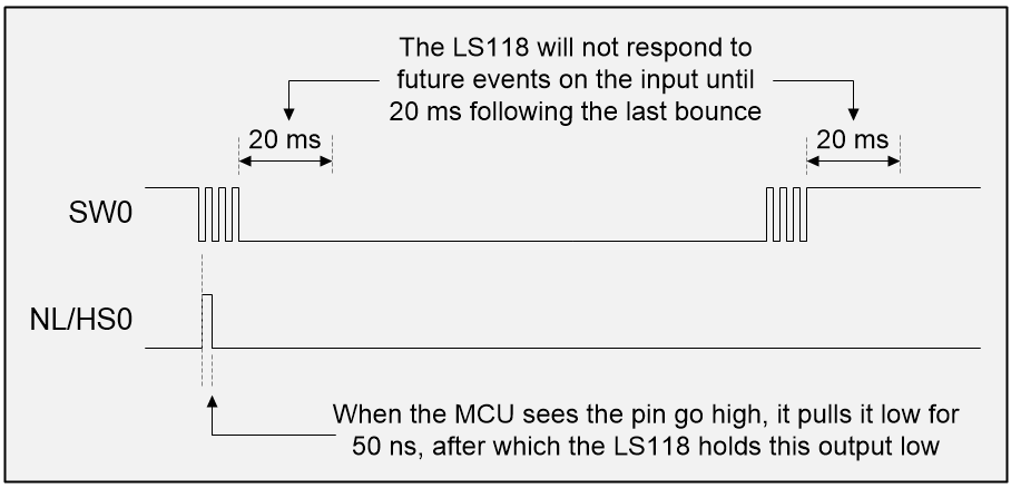 The first thing we noted about the LS118 is that its outputs are in the opposite phase to its inputs; that is, a logic 0 on a switch input will result in a logic 1 on the corresponding output. But the really cool thing about these devices is their unique 1-wire handshaking protocol. When the microcontroller (MCU) “sees” one of the NL/HS output signals from the LS118 go high, it can change its input pin into an output, pull the signal low for 50 microseconds (µs), and then return the pin to being an input.