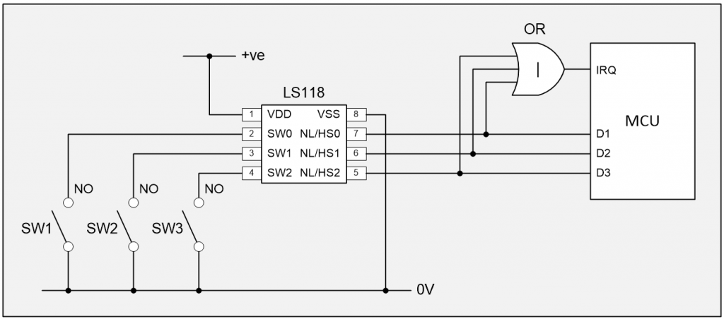 Bearing this in mind, let’s return to our system with three switches. If we wish to implement an interrupt-driven scenario using the LS118, we could do so as illustrated below:
