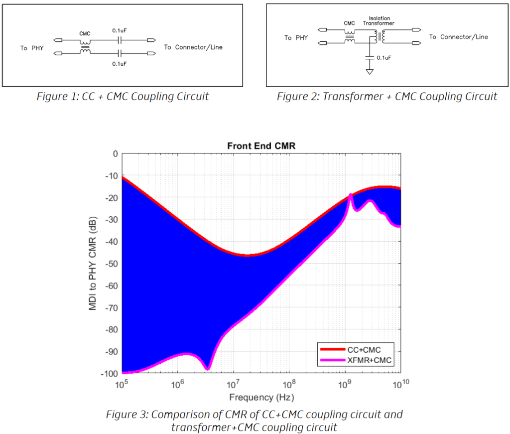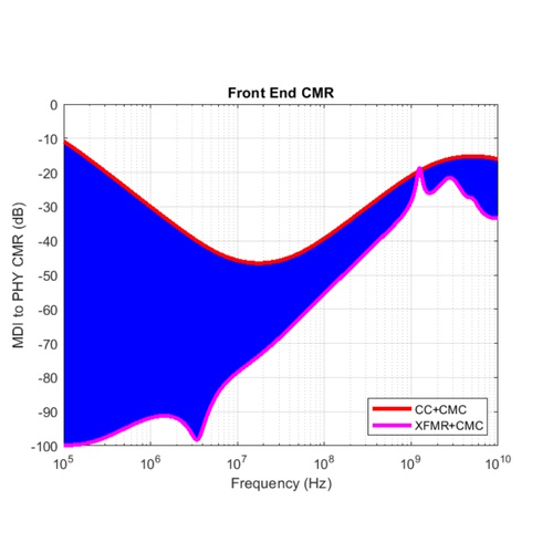 The reason I now know all this stuff is that I was just chatting with Andy Ackland, who is the CTO of UWBX. Andy told me that—to combat received noise and to meet emission standards—a lot of developers are implementing their SPE front-end isolation using a circuit that is comprised of two capacitors and a common mode choke (CMC) as illustrated in Figure 1 below. This provides good common mode noise suppression from 10MHz and up, but it falls off pretty significantly below 10MHz.
