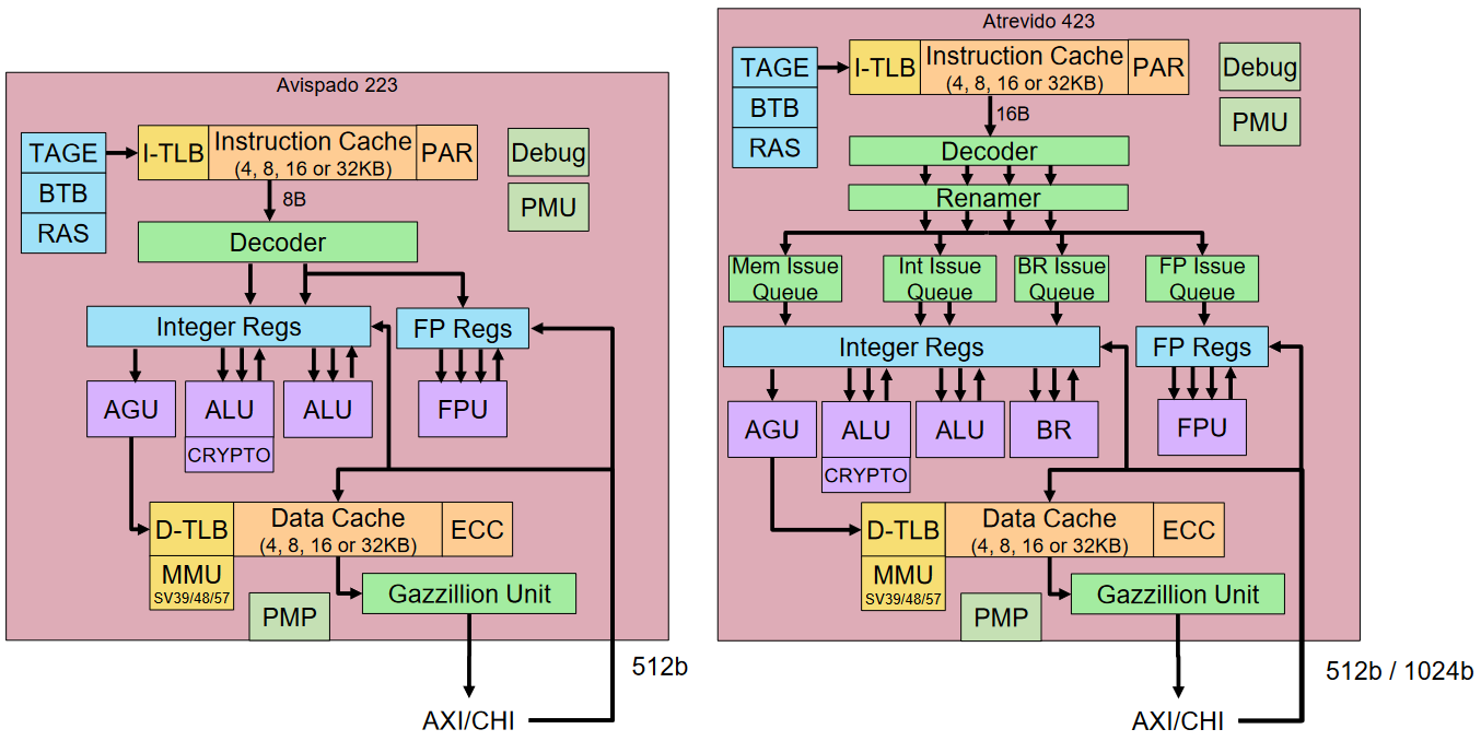 High-level block diagrams for the Avispado 223 (left) and the Atrevido 423 (right) (Source: Semidynamics)
