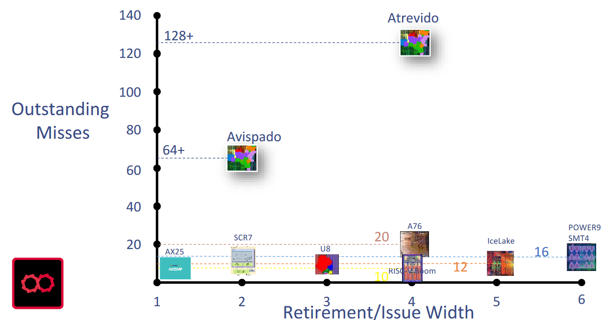 Observe the Gazillion unit in the block diagrams above. Roger says this is something that they’ve worked very hard on. The idea is that we want the core to stop as little as possible and Gazillion helps to avoid latency issues when accessing off-chip memory. In contrast to traditional processors, which employ a “stop-and-go” operating mode when encountering multiple cache misses, Gazillion technology allows the processor to send up to 128 requests to the memory system, thereby allowing the processor to continue to do useful processing while previous misses are served. To put this into perspective, the figure below compares the Gazzillion technology in the Atrevido and Avispado cores to other popular cores available in the market.