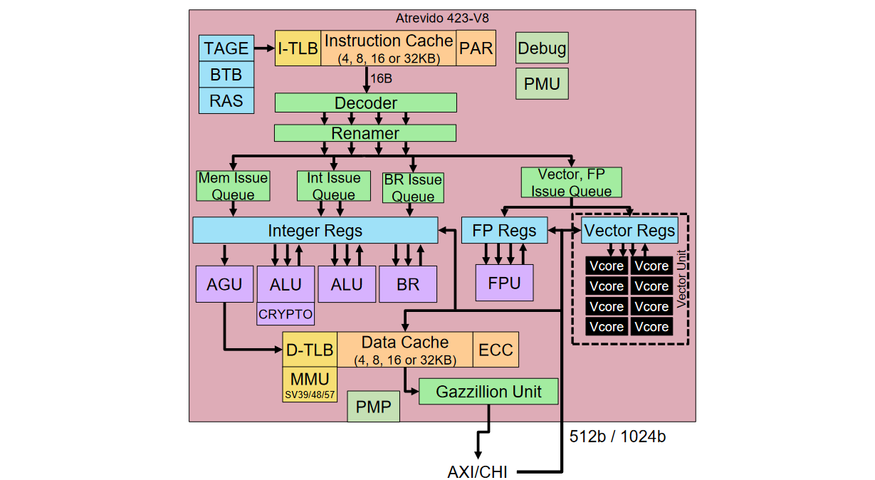 Both of these processors are available in two flavors—with an AXI interface for people who don’t need coherency and with a CHI interface for those who do. Both processors include a Gazillion Unit (shown in the block diagrams above), which dramatically improves memory accesses. And both processors can be augmented with the aforementioned OOO vector unit (not shown in the diagrams above, so you can stop looking for it). We’re on a roll here because both processor types also offer the following: