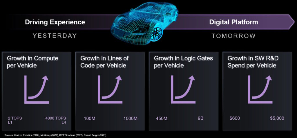 Good grief! From 2 TOPS for Level 1 (L1) to 4,000 TOPS for L4, from 100 million to 1,000 million lines of code, from 450 million to 9 billion transistors, and from $600 to $5,000 growth in software research-and-development spend per vehicle. Now, that’s exponential!
