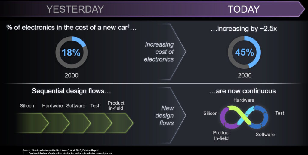 This concept covers multiple markets, including hyperscalers (humongous data centers supporting elastic clouds providing mindboggling computational resources), aerospace, industrial, medical, etc. For the purposes of our discussions, however, Tom focused on automotive, so it’s lucky this was the one that was highlighted in purple in the middle of the image above (what are the odds?).