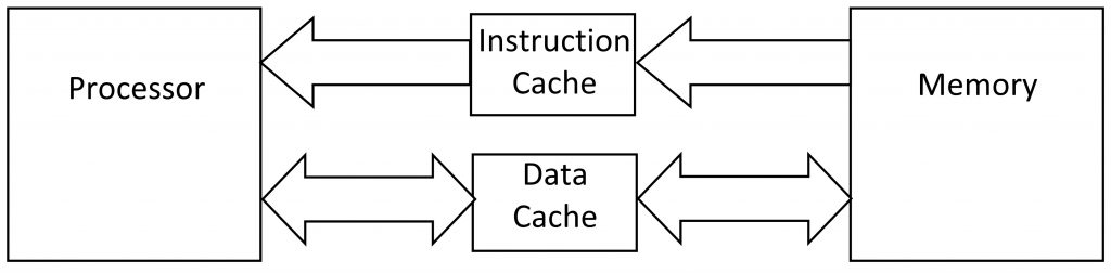 Some processors have more than one cache: one just for software and a separate cache for data. This reduces thrashing even more but adds still more to the cost. Note that instructions always go from memory to the processor; processors don’t write software, they read it. Data can go both ways.