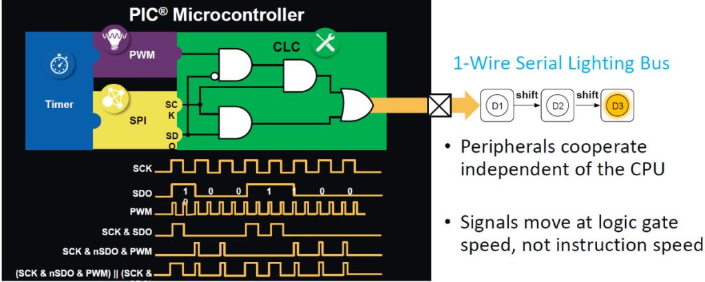 Specifying “which LED” and “what color” involves a fairly complex signal and can require a substantial amount of data to be sent out. This would typically require a high-speed 32-bit MCU. However, by using a handful of CIP peripherals — timer, SPI, PWM, and a little bit of logic implemented using CLCs (configurable logic cells) – it’s possible to implement this algorithm on an 8-bit PIC microcontroller. (This same function can be implemented on an AVR using configurable custom logic (CCL) as opposed to the PIC’s CLCs.)