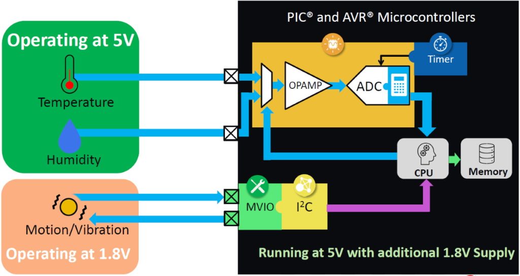 The example above shows the combination of MVIO and I2C, but the MVIO can also be used with general-purpose input/outputs (GPIOs). In fact, this leads to another example, because an 8-bit PIC or AVR MCU running at 5V may be used to read the values from a sensor, thereby achieving a better resolution than is possible with a 3.3V MCU, and the PIC/AVR could then use its MVIO capability to communicate this data to a 3.3V 32-bit PIC32 SAM MCU, for example.