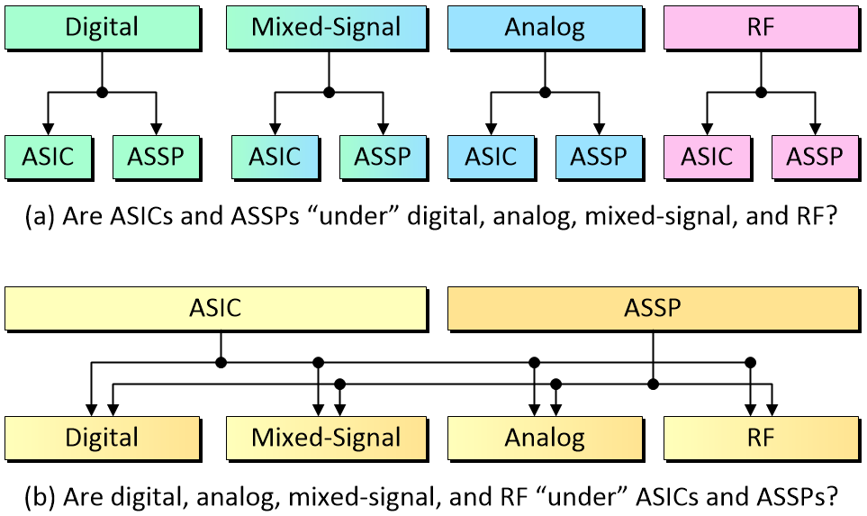 Generally speaking, an application-specific integrated circuit (ASIC) is a component that is designed and/or used by a single company in a specific system. By comparison, an application-specific standard part (ASSP) is a more general-purpose device that is intended for use by multiple system design houses in multiple systems (say a USB interface chip, for example). This leads us to an interesting question — do we regard ASICs and ASSPs as falling “under” the analog, digital, mixed-signal, and RF “umbrellas” (Figure 1a), or do we visualize things as being the other way around (Figure 1b)?