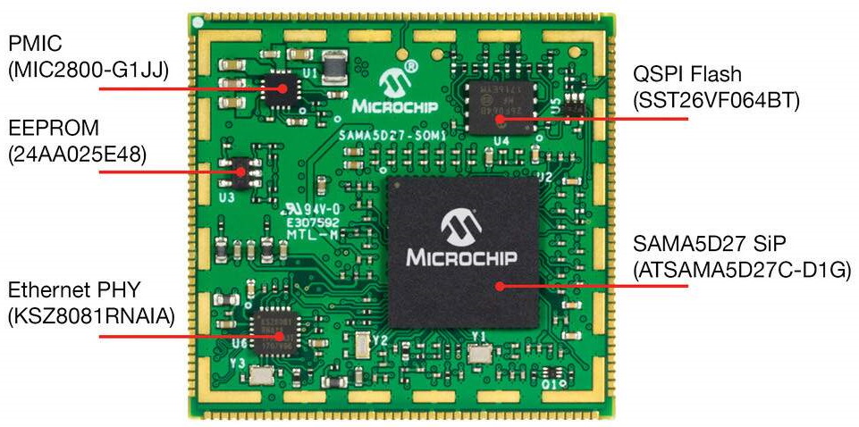 An alternative interpretation is for the SOM to be no bigger than a large IC. A classic example of this interpretation is the SAMA5D27 SOM from Microchip Technology.
