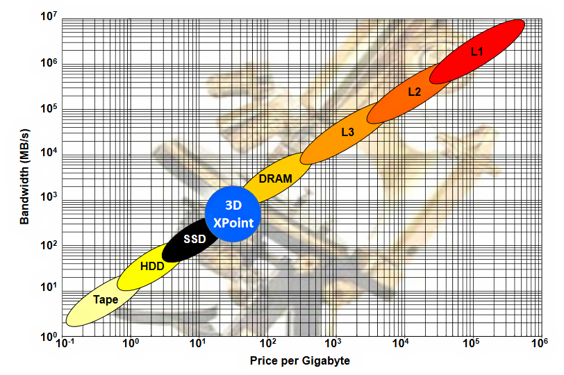 There are many candidate technologies for implementing PM including MRAM (magnetic RAM), ReRAM (resistive RAM) and CBRAM (conductive bridging RAM), FeRAM (ferroelectric RAM), and PCM (phase-change memory), just to name a few. To succeed, any candidate technology trying to worm its way into the memory/storage hierarchy needs to provide more bandwidth than the technologies below it and must cost less per bit (or gigabyte) than technologies above it on the chart.