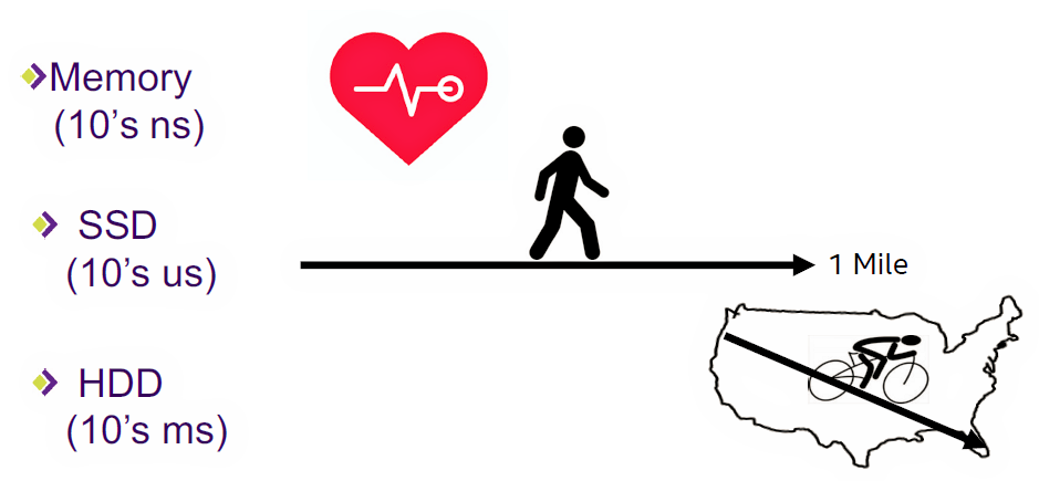 Imagine that DRAM latency is one second. (Normally, it’s on the order of tens of nanoseconds.) We all carry an internal, one-second reference clock. It’s our heartbeat. Assuming that one second is the baseline time scale, then an SSD satisfies a data request in the time that it takes you to walk a mile. That’s a lot of heartbeats, ignoring the affect this walk has on your heart rate. Using this same expanded time scale, you have enough time to ride a bicycle from Intel’s campus in Hillsboro, Oregon to Miami Beach while waiting for a hard disk drive to satisfy a data request.