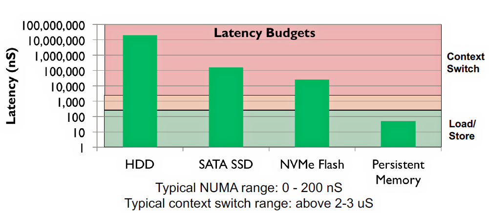 Figure 3: The load/store threshold at around 200 nsec differentiates memory from storage. (Image Source: Jim Pappas, SNIA, and Intel)