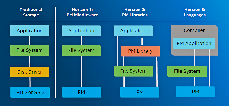 In the final stage, called Horizon 3 by SNIA, the operating system directly incorporates PM APIs, and compilers use them to directly access data stored in PM attached to the processor bus. How soon will this happen? Linux, Microsoft Windows, and VMWare have all incorporated PM APIs already, according to Pappas. The latest Java Virtual Machine (JVM) has also incorporated built-in PM APIs, so any Java application can now access PM as well.