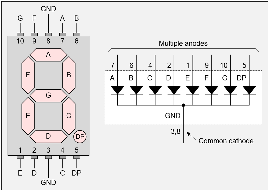 I’m using 10-pin single digit common cathode 7-segment displays. Note that the “7-segment” portion of the moniker refers to the seven rectangular-ish elements used to display the digits; there’s also an eighth element that can be used to represent a decimal point (DP).