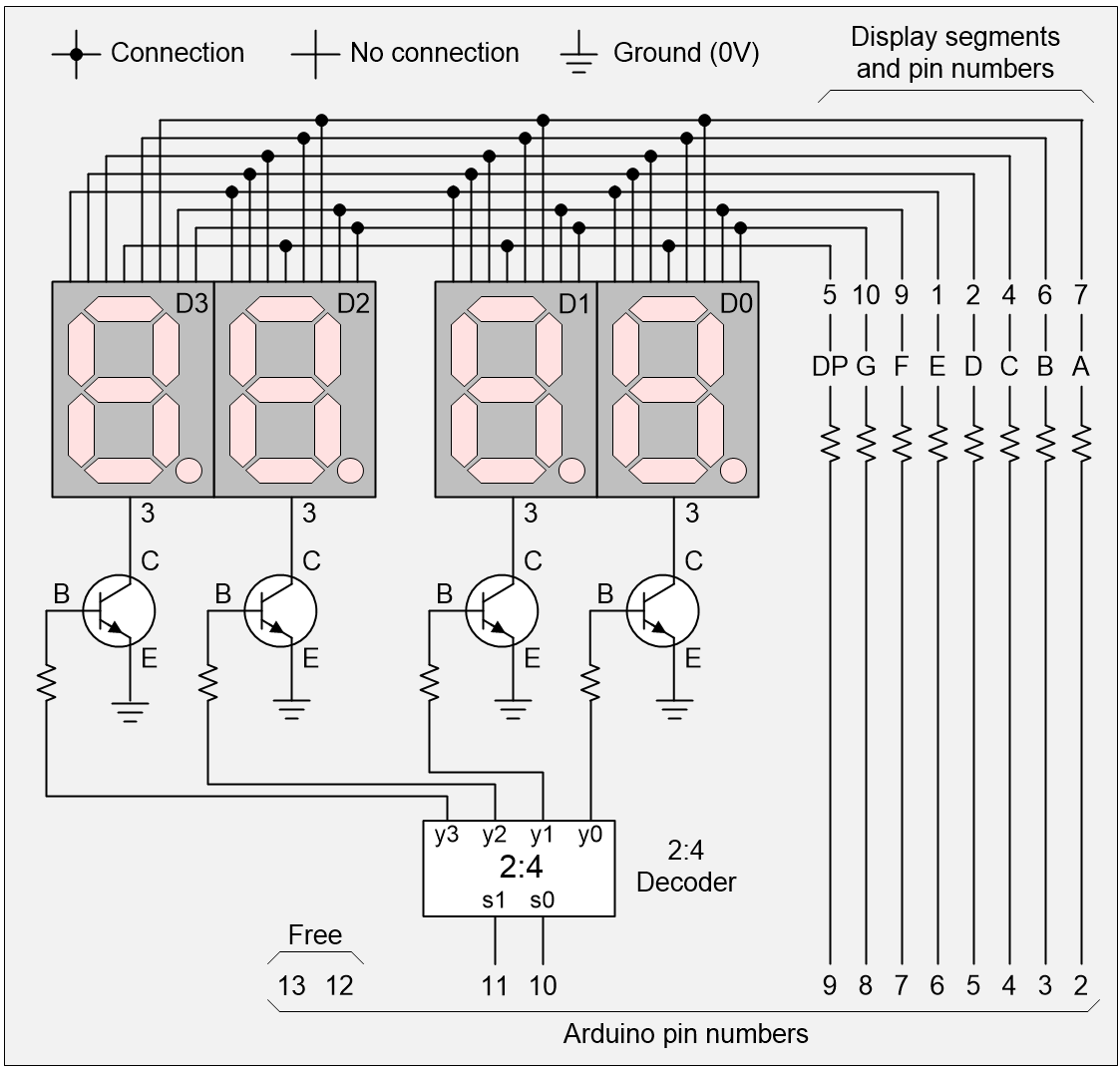 The problem is that we’ve now maxed-out our 12 pins. One way to free up some pins would be to use a 2:1 decoder. In this case, we could use two of the Arduino’s pins (say 11 and 10) to cycle through four binary combinations, 00, 01, 10, 11 and back to 00 again. Our 2:4 decoder can take these patterns and translate them into the 0001, 0010, 0100, 1000 equivalents we require to drive our transistors as illustrated below.