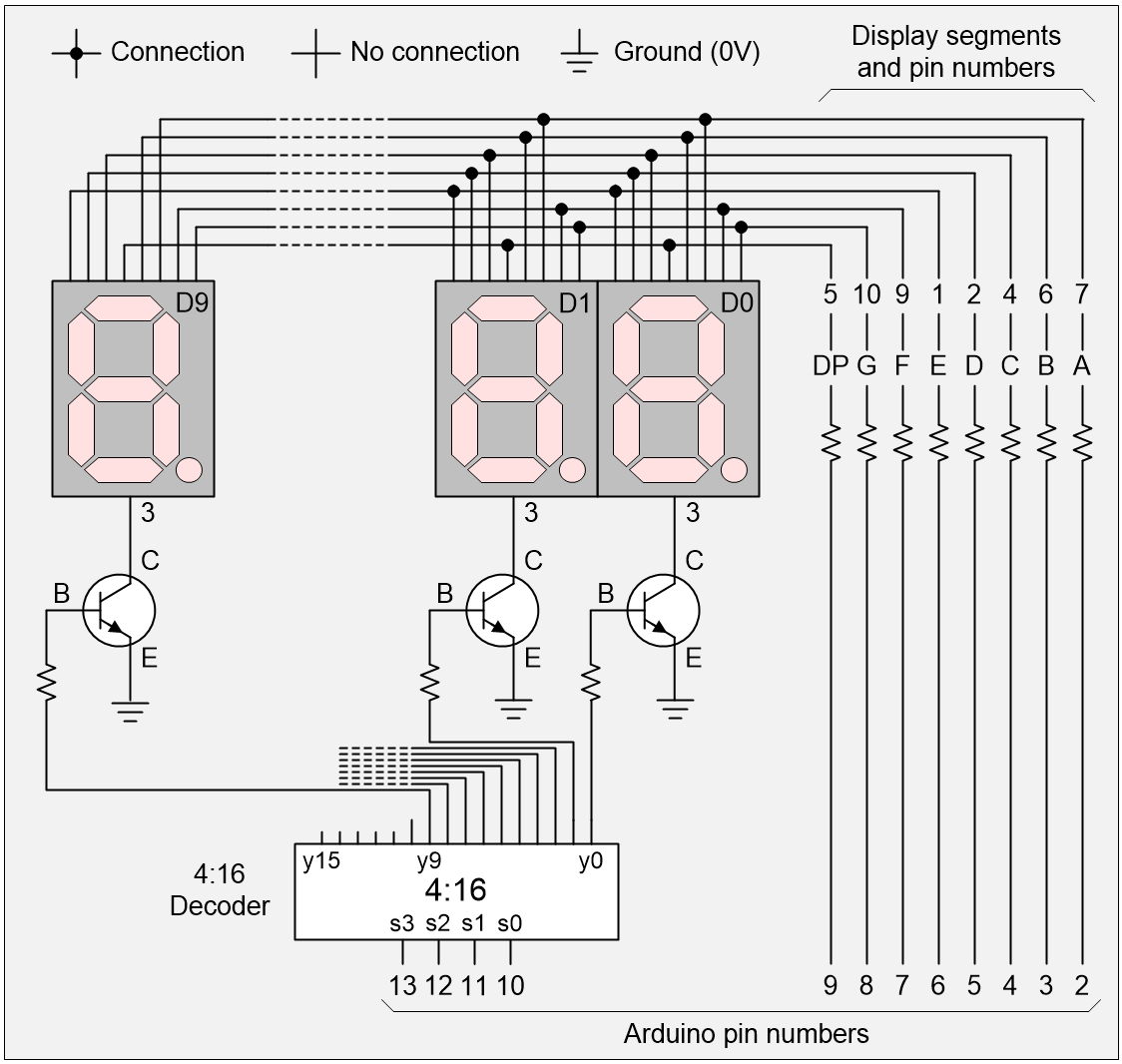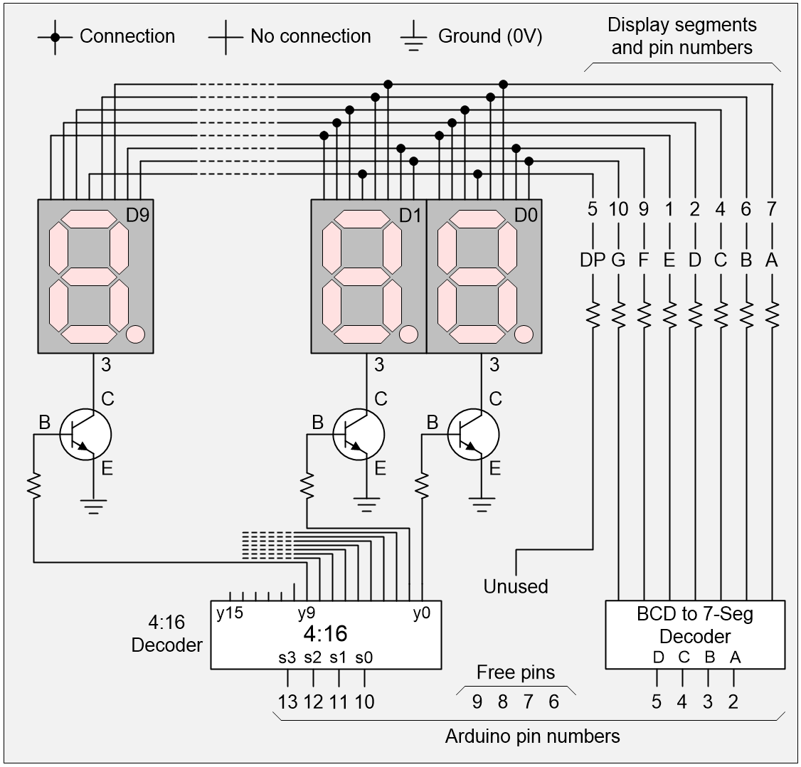 We could use a similar approach to extend the number of displays. For example, we could use a 3:8 decoder to drive 8 displays, but this would leave us with only 1 pin free. Similarly, we could use a 4:16 decoder to drive up to 16 displays, thereby meeting or exceeding our goal of 10 displays, but this would once again consume all our pins as illustrated below.