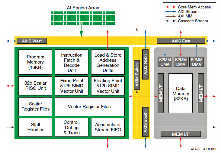 Each AI Engine tile has a 32Kbyte local data SRAM that’s also directly connected to the SRAMs in the four immediately surrounding AI engine tiles (north, south, east, and west). An AI Engine tile can “borrow” memory from these four adjacent tiles, easing the development of asymmetrical task engines.