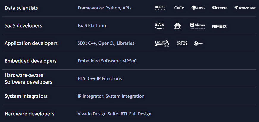 Data scientists are accustomed to working with frameworks such as Caffe and TensorFlow. Application developers use HLLs such as C++ or other specialized frameworks such as OpenCL. Embedded developers are accustomed to writing microprocessor code in C or C++, and they want to run that code on standard operating systems such as Linux. Wizened FPGA hardware developers know how to get the most performance out of Xilinx devices by writing RTL code using Verilog and VHDL, and they will want to continue doing so with Versal devices.