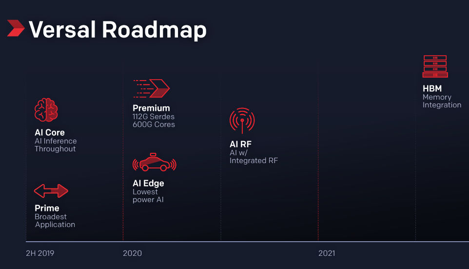 In an unusual move for the company, Xilinx has laid out a multi-year roadmap for the Versal series. Devices in the first two announced series, Versal AI Core and Versal Prime, will start to ship in the second half of 2019—possibly as much as a year from now or more. Two more AI members, Versal AI Edge and Versal AI RF with integrated RF ADCs and DACs, will ship in 2020, as will members of the high-end AI Premium series with the really high-speed Ethernet IP and the 112G PAM4 SerDes ports. Finally, the Versal devices with integrated HBM DRAM will ship in 2021.