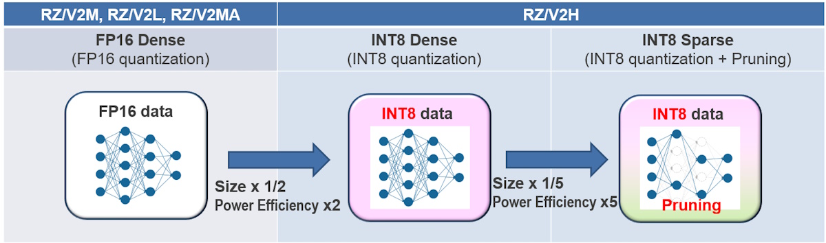 We should perhaps note that the RZ/V2H employs the third generation of the DRP-AI. Earlier versions were based on 16-bit dense floating-point (FP) quantization. The new engine is based on 8-bit integer quantization, either dense or pruned/sparse.