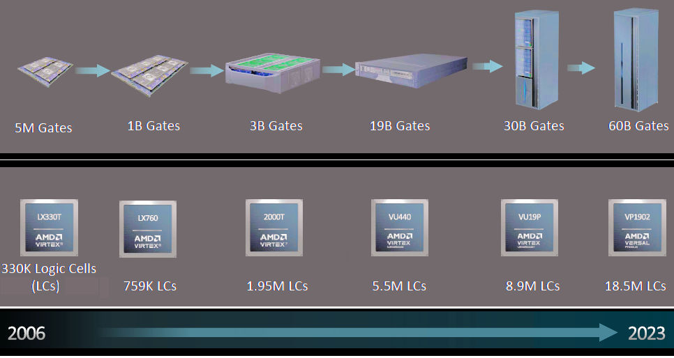 Figure 2: The capacity of FPGAs used for ASIC and SoC emulation and prototyping have grown by a factor of 56x from 2006 to 2023, allowing the capacity of systems based on these devices to grow by more than 10,000x over the same period. Image credit: AMD