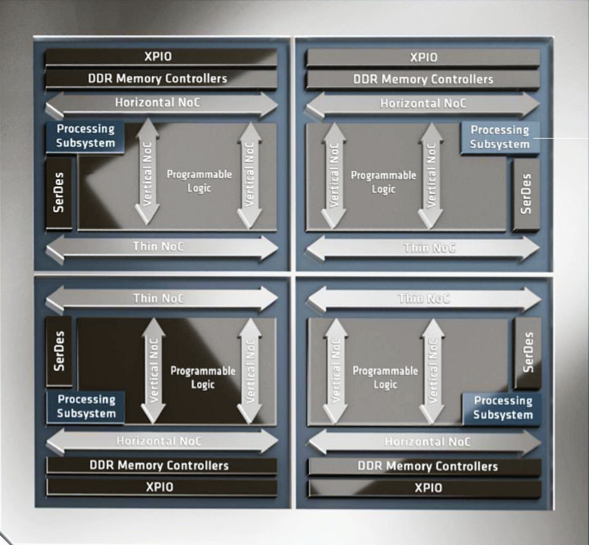 One disadvantage of chiplet-based construction for FPGAs appears at the die-to-die interface. Connections are costly at that point and the inter-die interconnect density is lower, so there are fewer interconnects per millimeter of beachfront between chiplets compared to the interconnect density within the on-chip FPGA fabric. In addition, die-to-die interconnect is generally slower than on-die interconnect. Consequently, the use of multiple chiplets creates I/O bottlenecks. As Figure 1 suggests, there was no way to weave the independent FPGA fabrics on the four chiplets in the VP1902 SoC together into one seamless programmable-logic fabric, so there’s a discontinuity as signals in the fabric traverse the die-to-die interconnect. It may well be that AMD uses the NoC to interconnect the four FPGA fabrics in the VP1902 SoC. In any case, the vendor’s design tools usually attempt to minimize this discontinuity as much as possible through careful block placement, so that only lower-speed buses traverse these die-to-die interconnect bridges. AMD has stated that it is enhancing the place-and-route and partitioning capabilities of its Vivado ML tool suite to accommodate multi-tile devices like the VP1902 SoC.
