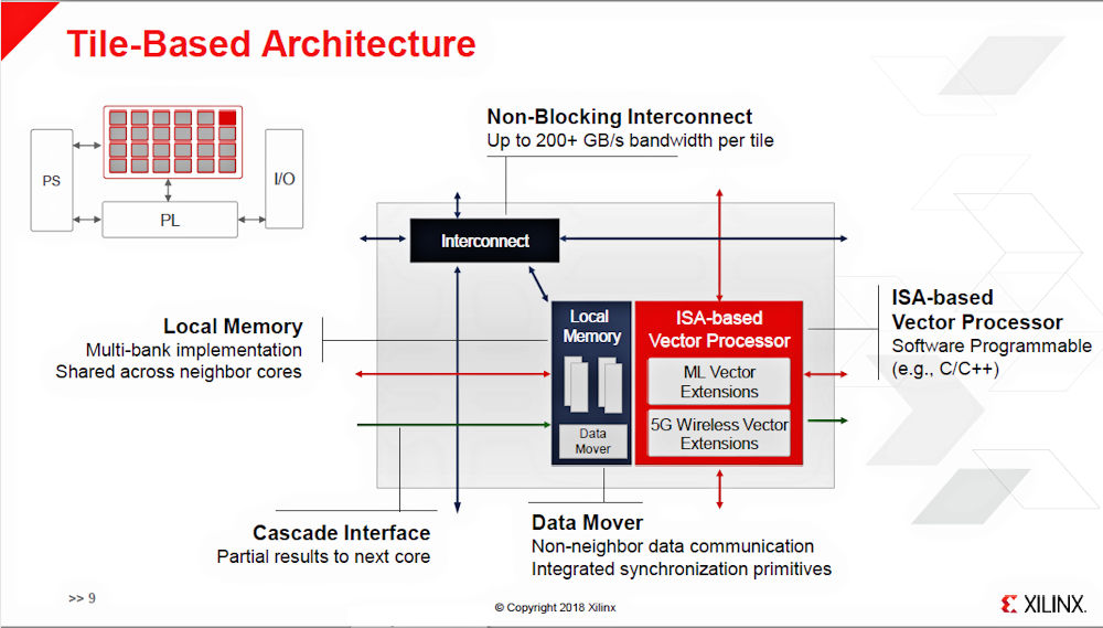 The HW/SW Programmable Engine array communicates independently with the PS (processor system) and the PL (programmable logic) in the Everest design. Each tile in the array consists of a software-programmable, VLIW vector processor coupled to local memory and a data mover (a DMA machine).