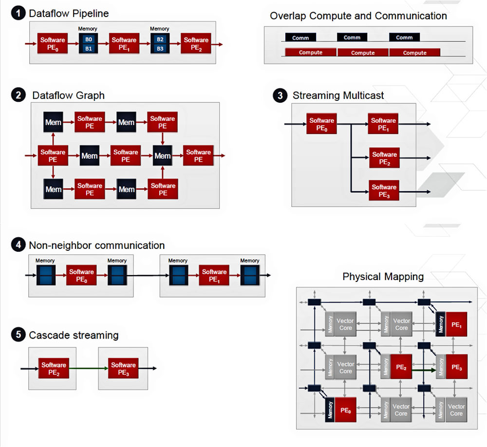 Configuration 1 is a simple one-dimensional, unidirectional dataflow pipeline. Each processing tile partially processes an incoming stream of data and then passes the result through a local memory buffer to the next tile in the pipeline. Configuration 2 implements a dataflow graph, which might be considered a 2D, 3D, or more-D version of a pipeline. Essentially, it’s still a pipeline but with pipes running in multiple dimensions. Configuration 3 takes advantage of the NOC to multicast results from one processing tile to two or more subsequent tiles simultaneously. Configuration 4 uses input and output memory buffers to match variable, differential processing rates for tiles connected over the NOC. Configuration 5 uses the tiles’ cascade interface to pass intermediate results from one tile to the next without consuming other interconnection resources.
