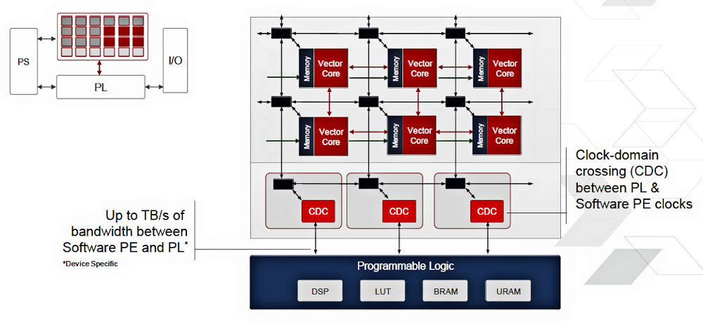 You can use the connected PL to augment the HW/SW Programmable Engine’s capabilities in multiple ways. For example, you can use the PL’s RAM arrays to increase the vector processing tiles’ access to on-chip SRAM (BRAM and UltraRAM) blocks in the PL with low latency through the deterministic NOC. It’s also possible to use the PL to implement hardware accelerators that can perform specialized computations faster than the tiles’ vector engines. Noguera suggested that you can also use the PL to create “ISA extensions” for the tiles, but he did not elaborate.