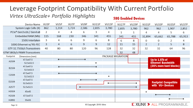 Looking under the hood a bit on the Xilinx 58G announcement (and comparing and contrasting with Intel’s), Xilinx is adding two new devices to the Virtex UltraScale+ portfolio – the VU27P and the VU29P – with 32 and 48 of the new PAM4 transceivers respectively. By comparison, Intel’s 58G Stratix 10 TX offering packs up to 60 channels at 58 Gpbs (144 transceivers total), giving Intel a big advantage on total PAM4 transceiver count. Intel’s Stratix 10 TX family includes four new devices with 58G PAM4, and their MX family has two more, for a total of six devices versus Xilinx’s two, giving Intel more total options as well. Furthermore, Intel’s MX line has the intriguing combination of both 58G SerDes and HBM2 memory which will be a killer combination for certain applications.