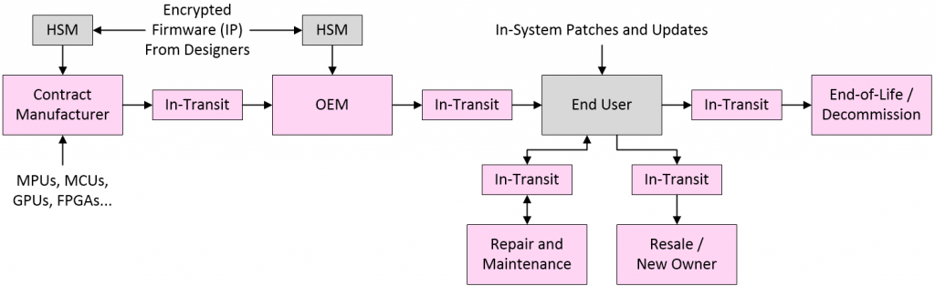 The key point here relates to the firmware that is to be loaded into components like CPUs, MPUs, MCUs, GPUs, FPGAs, and/or the memory devices that serve them. Such firmware can potentially be compromised at any point in the supply chain. Of course, the designers of the system deliver their firmware IP in encrypted form, cryptographic keys are shared only with trusted players, and the cryptographic keys and encrypted firmware are injected into the target components using hardware security modules (HSMs). Unfortunately, when it comes to today’s dedicated Tier 1 hackers, the entire process leaks like a sieve.